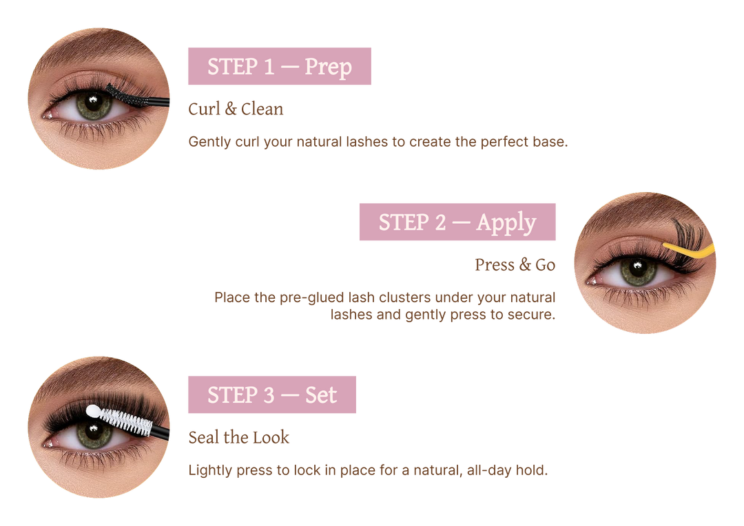 Just three simple steps to achieve natural, seamless lashes that stay comfortable and flawless all day.